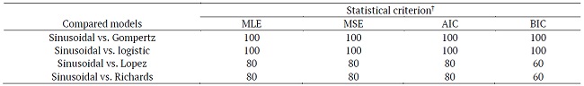 In general, a comparison between models based on the calculated statistical criteria (Tables 4 and 5) indicated some relevant differences between functions. The logistic equation gave higher values of these statistics than the other growth functions. These statistical criteria clearly demonstrate the suitability and superiority of the sinusoidal, Lopez and Richards equations over the others.