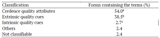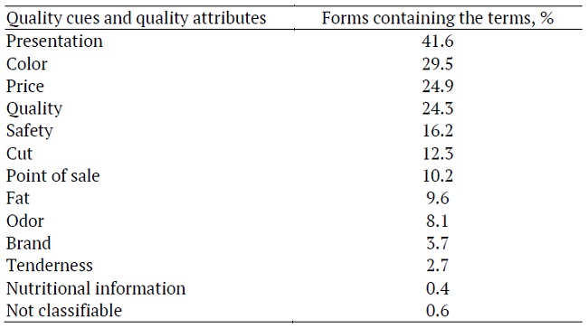 Intrinsic quality cues, extrinsic quality cues, experience quality attributes and credence quality attributes in which the terms cited in the spontaneous research could be classified (Table 2). The most present attributes in the forms were meat presentation and color (41.6% and 29.5%, respectively). A fact that attracts attention is that in none of the forms were registered terms referring to meat inspection. However, the consumer can understand what form of presentation and color could mean similar attributes; thus, form of presentation and color would represent 71.1% of the quality attributes of meat.