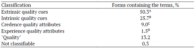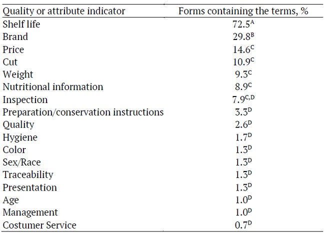 The term "quality" appeared in 24.3% of the forms. This term indicates consumer concern at the time of product acquisition; however, does not bring any specific information, and can assume several meanings. For this reason, when cited, the term "quality" was not considered.