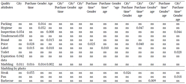 The influence of city size, purchase period, gender and age and their interactions on the importance attributed to the terms surveyed and on the purchase preference related to marbling by photograph (Table 4).