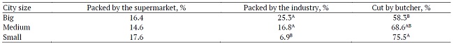The size of the city in which interviews were conducted also has an influence on the preference for presentation for sale. In the big and medium-sized city, preference is given to the meat cut by the butcher in relation to the pre-packaged meat, without distinction between that which has been packaged by the industry or by the market. In the small city there is also a preference for the meat cut by the butcher, however there is also a preference for the meat packaged by the market than the meat packed by the industry.