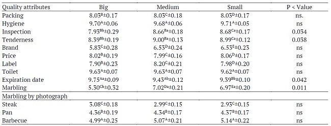 The data showed that there is a difference in the importance attributed to meat inspection, tenderness, expiration date and marbling in relation to the city size. Regarding these four parameters, a similar behavior among beef buyers in the middle and small city was observed, deferring from the big city. Thus, in medium and small cities there was a greater appreciation of inspection, tenderness and marbling and less importance was given to the expiration data than in the big city.