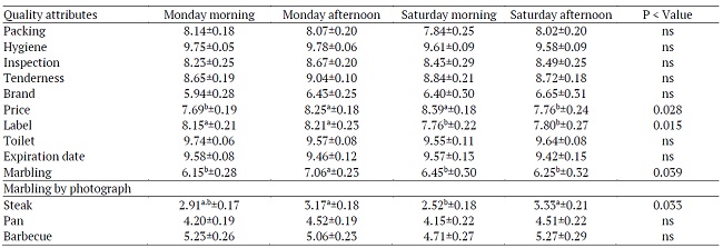 Differences were found in how interviewees (meat buyers) valued price, marbling and label at different purchase time. The price was most important for buyers interviewed on Monday afternoon and Saturday morning, label for interviewees at both Monday times, and marbling for the interviewees on Monday afternoon. These differences may be associated to the variation in consumer age that frequents the supermarket at different purchase times (data not shown). While the frequency of purchasers above 55 years was relatively uniform in all periods evaluated, there was a higher frequency of young people in both periods on Monday than in both periods on Saturday. At the same time, there was a greater presence of buyers of meat of productive age (between 25 and 55 years) on Monday afternoon than in the other three periods surveyed.