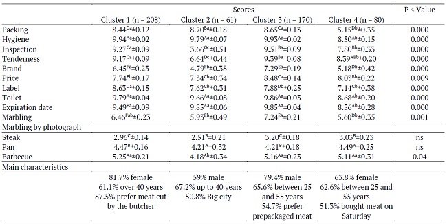 The four clusters obtained in this study have some distinct characteristics. In relation to Cluster, the largest group, the meat buyers considered hygiene and toilet the most important factors, while price, marbling and brand were considered the least important. The majority of this cluster were female (81.7%) and 87.5% preferred the meat cut by the butcher.