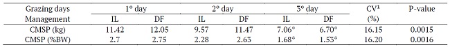 These results corroborate Blaser et al. (1986) who evaluated intermittent stocking grazing with three days of occupation and reported an increase in milk yield from the first to the second day and a decrease on the third day, whereas, with five days of occupation, increases were found in yield from the first to the third day and from this decrease until the fifth day of grazing. The authors associated such variations with the mass of forage and selectivity in grazing, where, on the first day, the forage consumed presented higher nutritive value that was reduced during the period of occupation.