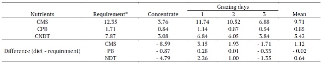 On average, there was a 41.4% reduction in dry matter intake from the first to the third day of occupation, which may suggest that the animals underwent food restriction on the last day of grazing. This possible restriction may have caused higher intake on the first day, which is superior to the requirement of these animals, according to NRC (2001), in intake of dry matter, crude protein and total digestible nutrients intake.