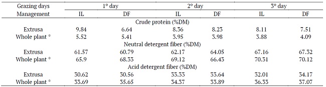 The reduction in content of CP and increase in fiber constituents (NDF and ADF) were more evident in the results of whole plant compared to the extrusa, showing that the animals selected portions of the forage supplied with higher nutritional value. Results similar to the present study were found by Clipes, Silva, Detmann, and Vásquez (2006), who evaluated Mombasa guinea grass under intermittent stocking grazing with occupation of three days and found increases in the fiber constituents of this forage.