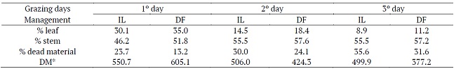 The reduction in forage quality during the period of occupation of the paddocks was accompanied by the reduction of leaves and percentage increase of stem and dead material (Table 4). The reduction in pasture DM availability also occurred gradually over the days of occupation.