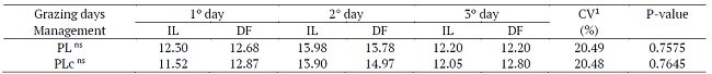 The animals managed according to IL showed intake on the first day similar to the second day, but intake on the first day was higher than in the third day. In relation to DF, intae did not differ between the first and second day, and the intake of the third day was lower than in the first two days.