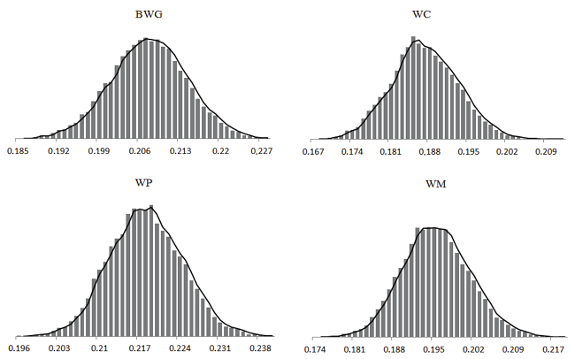 Direct heritability estimated for weaning traits showed similar values (Figure 1), with mean of 0.21 ± 0.03 (BWG), 0.19 ± 0.03 (WC), 0.22 ± 0.03 (WP) and 0.20 ± 0.03 (WM), indicating that selection based on these traits should provide improvements in productive performance of Nellore animals, leading to greater weight gain and body composition at weaning in the progenies. Similar results were reported by Araújo et al. (2010), Laureano et al. (2011) and Regatieri, Boligon, and Albuquerque (2011).