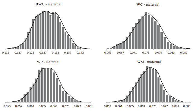 On the other hand, maternal heritability showed low magnitudes (Figure 2), with the same mean value estimated for WC, WP and WM (0.07±0.01) and 0.13±0.01 for BWG, suggesting that selection for maternal ability should provide at long-term benefits for weight gain of calves and visual scores at weaning. For Nellore cattle and same traits, Forni, Federici, and Albuquerque (2007) reported similar heritability to those obtained in this study.