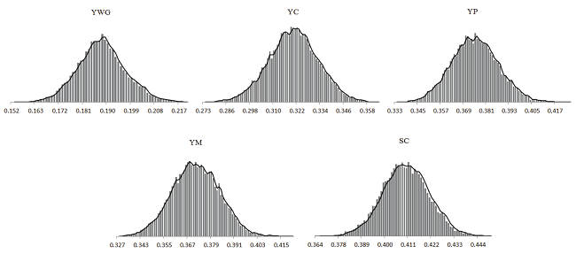 Direct heritability distributions for yearling traits are illustrated in Figure 3. Despite the low heritability estimated for YWG (0.19 ± 0.04), it is expected that the use of sires with higher breeding values for this trait could improve the growth of progenies, reducing the time to obtain the minimum weight for slaughter. Similar estimate was reported by Laureano et al. (2011). For the other traits measured at yearling, the mean heritability (YC: 0.32 ± 0.05, YP: 0.37 ± 0.05, YM: 0.38±0.05, SC: 0.41 ± 0.04) indicated important influence of the direct additive genetic component. Therefore, yearling visual scores and SC are expected to respond favorably to direct selection.