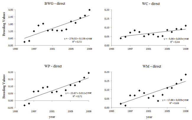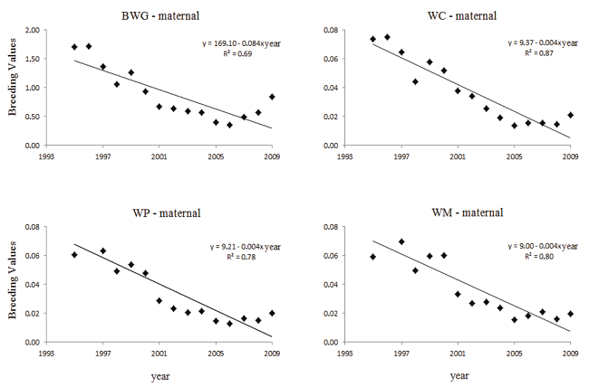 In general, although the genetic gains obtained are numerically low, genetic progress must be considered, since genetic changes are cumulative and permanent over the generations. However, genetic changes may not be expressed phenotypically due to different rearing environments over the years. In addition, improvements in maternal ability could be obtained with the selection also based on maternal breeding values predicted for weaning economical traits.