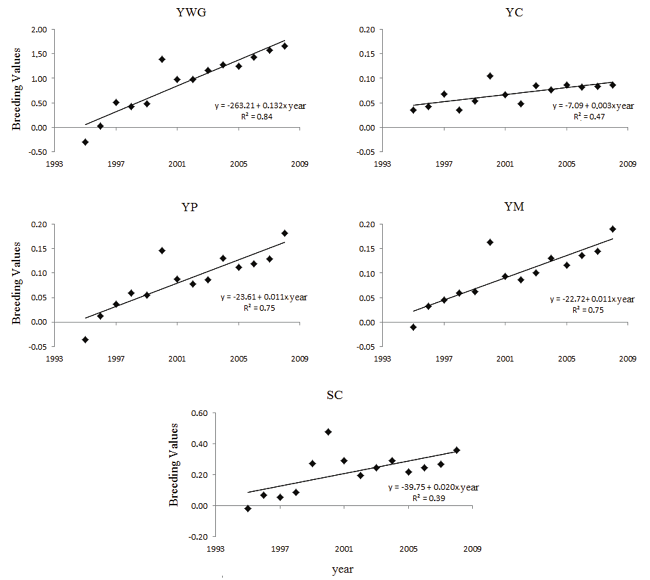 Genetic trend has been used in studies on several breeds as a statistical resource that allows monitoring the efficiency of selection procedures over time, for different traits (Chud et al., 2014; Holanda, Barbosa, Ribeiro, & Santoro, 2004; Laureano et al., 2011; Plasse et al., 2002). In addition to indicating the advantages and possible damages related to the selection methods adopted, the knowledge of the genetic changes of economic interest traits allows a better orientation in future decisions of directly selected traits, as well as of correlated traits. Thus, monitoring changes in genetic parameters and breeding values in each population is certainly decisive to bring support to beef cattle producers to select animals.