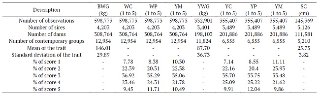 In modeling these traits, covariates considered for each trait were: visual scores and SC [animal age at recording and dam age at calving (linear and quadratic effects)]; BWG [days number of birth at weaning (linear effect) and dam age at calving (linear and quadratic effects)]; YWG [days number of weaning at yearling (linear effect) and dam age at calving (linear and quadratic effects)]. Direct additive genetic and residual effects, in addition to maternal additive genetic and maternal permanent environmental effects for weaning traits (BWG, WC, WP and WM), were included as random effects.