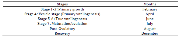Samples of five fishes were collected monthly, from July of 2008 to June of 2009. The animals were anesthetized in solution of benzocaine (0.1 g L-1), and the euthanized by dissection of the cervical spinal cord. Afterwards, ponderal and morphometric data were recorded (2n: 1442.7 g ± 97.17 in weight and 44.5 cm ± 0.90 in total length; 3n: 1344 g ± 75.77 in weight and 44.6 cm ± 0.88 in total length). After dissection, the liver, ovaries, and viscera were weighed to calculate, respectively, the hepato-somatic index (HSI) - [HSI = (liver weight total weight-1). 100], gonado-somatic index (GSI) - [GSI = (gonad weight total weight-1). 100], and viscero-somatic index (VSI) - [VSI = (weight of viscera (despising the weight of gonads) total weight-1). 100], which express the percentage these tissues represent in relation to the animal’s body mass. Subsequently, the ovaries were examined and classified macroscopically, following Bromage and Cumaranatunga (1988) method, which is presented in Table 1. Then, samples of liver, white muscle from the antero-dorsal region, and ovaries were collected, frozen, and stored at -80°C until analysis.