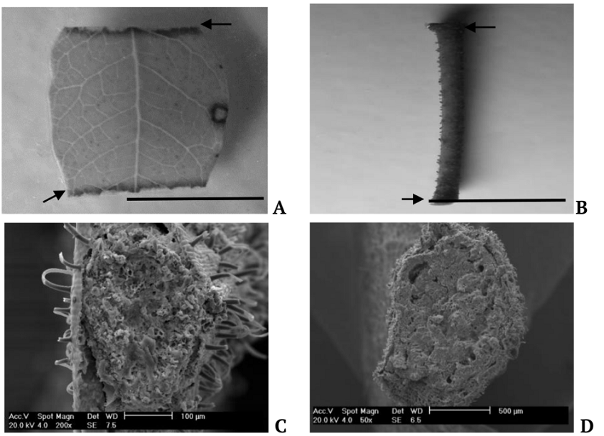 In the test of in situ and in vitro tissue degradability, the leaves of the catingueira presented a pattern of similar behaviour for all the ages under evaluation; this was a physical barrier that prevented the access of microorganisms, allowing the leaf fragments and the petioles to remain intact (Figure 1 A-D).
