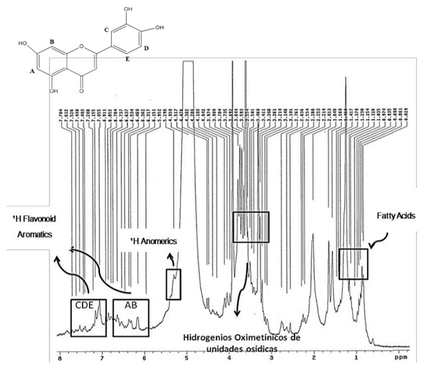 The extract under study also proved to be rich in flavonoids by 1H-NMR analysis, showing absorptions between 6.1 and 6.3, characteristic of the flavonoid A-Ring, and between δH 7.06 and 7.50, characteristic of the flavonoid B-Ring (Figure 2).