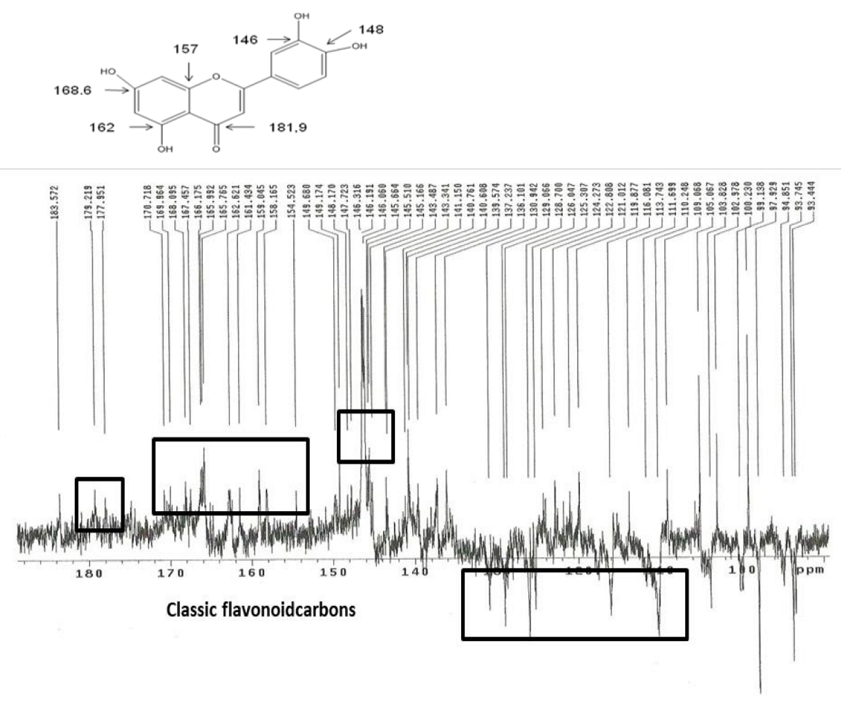 In the same spectrum, signals between δH 3.0 and 5.3 were seen compatible with osidic units common in Fabaceae. As this was an analysis of a crude extract, a further analysis of carbon-13 (Figure 3) was performed where data compatible with flavonoids and osidic units could be seen: among the signals at δC 84.3 and 60.5 that are compatible with the structure of pinitol; between the chemical shift at δC 183.9 assigned to C-4, a set of signals at δC 168.8 to 157.2, characteristic of the C-2, C-5, C-7 and C-9 carbons of the benzopyran unit of flavonoids; and again between the signals at δC 133.6 and 112.9, characteristic of flavonoid sp2 carbons. Guidance signals confirming the chemical shifts of flavonoids were seen at δC 96.6 and 100, both CH compatible with C-6 and C-8 shifts and the signals at δC 106.5, 105.5 and 101.8, non-hydrogenated carbons that confirm the fusion of flavonoid units.