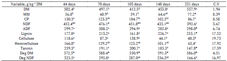 The levels of dry matter, crude protein, neutral detergent fibre, mineral matter and NDF degradability (Deg NDF) varied in relation to leaf maturity. The CP and Deg NDF content showed a high negative correlation with the increase in leaf age, both with r = -0.8 and p > 0.05, and the NDF with r = - 0.9 and p > 0.01. The ADF components, DM degradability and tannin content showed no variation in relation to leaf age (Table 1).