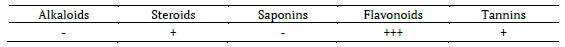 Through phytochemical prospection, the presence of two main classes of secondary compounds, terpenes and phenolic compounds, was detected (Table 2). The number of positive signs (+) indicates the intensity of presence of the compound in the sample. No alkaloids or saponins were detected in this species.