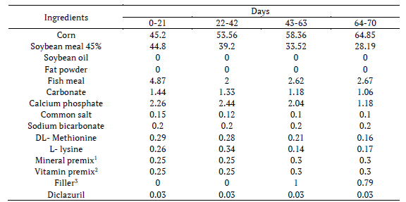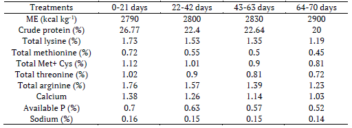 In order to carry out this research, 240 day old male turkeys from BUT6 strain were used. This experiment was conducted in a completely randomized design with five treatments, six replicates and eight turkey chicks per replicate. The diets in each individual treatment were balanced and the chicks were fed with diets from one to 70 days of old. Treatments included: Control diet (no fat supplement), diet containing 2.5% of soybean oil, diet containing 2.5% fat supplement, diet containing 5% soybean oil, diet containing 5% fat supplement. The diets were formulated with similar energy and nitrogen concentrations; according to the nutrient requirements of poultry (NRC, 1994). The ingredients and chemical composition of the control diets, which correspond to the standard dietary requirements for turkeys BUT6 strain, during four periods (0-21, 22 to 42, 43 to 63 and 64 to 70 days of age) are shown in Tables 1 and 2, respectively.