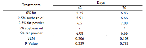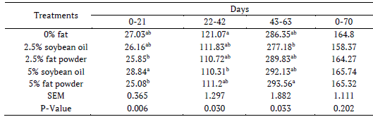The results of daily weight gain are presented in Table 4. In 0-29 days of age, 5% supplemented soybean oil significantly increased weight gain compared to 2.5 and 5% supplemented fat powder and 2.5% supplemented soybean oil (p < 0.05). In the period of 22-42 days of age, the treatment containing 5% soybean oil had the highest daily weight gain and the treatment containing 2.5% soybean oil had the least weight gain (p < 0.05). In the period of 43-63 days, the treatments containing 5% soybean oil and 5% fat powder did not differ significantly (p > 0.05), but both of these treatments significantly increased the weight gain compared with other treatments (p < 0.05). In the whole period, 5% soybean oil treatment had significantly higher weight gain than other treatments (p < 0.05).
