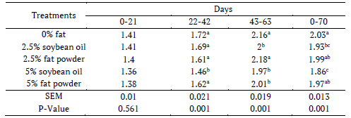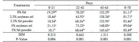 The results of feed intake were presented in Table 3. In the 0-21 days period, supplementation of 5% soybean oil had significantly greater feed intake than 2.5 and 5% supplemented fat powder (p < 0.05), while other treatments did not differ significantly (p > 0.05). In the period of 22-42 days of age, control treatment significantly increased feed intake compared to 5% supplemented soybean oil (p < 0.05), although other experimental treatments did not show any significant difference (p > 0.05). In the period of 43-63 days of age, the treatment containing 5% supplemented fat powder significantly increased feed intake compared to 2.5% supplemented soybean oil (p < 0.05), and other experimental treatments showed a non-significant difference.