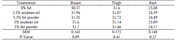 The tissue fat content of broiler chickens is more affected by vegetable sources containing high amounts of unsaturated fatty acids compared with animal fats (NRC, 1994). However, Ayed, Attia, and Ennouri (2015) reported higher abdominal fat percentages in broiler chickens fed rations with palm oil, which was rich in saturated fatty acids. Has-Schön, Škrtić, and Kralik (2008) concluded that the most favorable effects on the lipid status of turkey pectoral muscle were observed with the Pronova preparation. The results of Sanz, Flores, Perez de Ayala, and Lopez-bote (1999) showed lower amounts of stored fat in the abdomen of broiler chickens fed with sunflower oil compared to those fed oatmeal or fats. Crespo and Esteve-Garcia (2002) suggested that reduction of abdominal fat in broilers fed a diet supplemented with oil seems to be a consequence of higher lipid oxidation despite the higher synthesis of endogenous fatty acids. In other studies, researchers found that the accumulation of energy and fat in chicken recipient lard was higher than those fed with sunflower oil (Sanz et al., 2000). In broiler chickens, Abdulla et al. (2017) did not observe any effect of tested dietary energy sources on slaughter yield, breast and leg percentages from grill weight. In contrast to the results of this research, Poorghasemi et al. (2013) showed no significant effect of dietary lipid source on relative weights of the liver, heart and gizzard in broiler chickens. However, they confirmed the positive influence of mixing dietary saturated and unsaturated fats not only on breast muscles, but on leg as well.