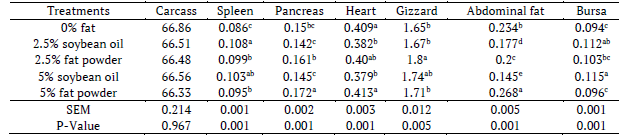 The results of carcass traits are presented in Table 6. The results showed that percentage of breast, thigh and back weight was not affected by experimental treatments (p > 0.05). As the results of the present experiment are indicated (Table 7), carcass weight was not affected by different treatments (p > 0.05). Treatment containing 5% soybean oil had significantly higher spleen weights than 0% fat (p < 0.05). Treatment containing 5% soybean oil supplements had significantly higher bursa weights than other treatments (p < 0.05). Treatment containing 2.5% supplemented soybean oil had significantly higher spleen weight than other treatments (p < 0.05). Treatment containing 2.5% fat powder and control treatment had significantly higher liver weight than other treatments (p < 0.05), while these two treatments did not differ significantly (p > 0.05). Treatment containing 5% fat powder had the highest pancreas weight (p < 0.05). The highest heart rate was obtained by experimental treatments containing 5% supplemental fat and control group (p < 0.05). However, there was no significant difference between these two groups (p > 0.05). Treatment containing 2.5% fat supplement had significantly greater gizzard weight than other treatments (p < 0.05). Treatment containing 5% fat had the highest amount of abdominal fat and 5% soybean oil group had the least amount (p < 0.05). As the results of the present study are indicated (Table 8), the effect of level and source of dietary fat on antibody titer against Newcastle disease vaccine was not significant on days 42 and 70 (p > 0.05).