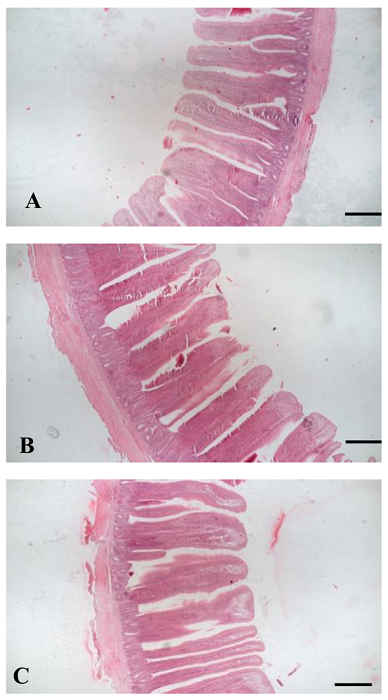 After slaughter, a 2-cm long segment was transected from the middle-length of jejunum; ingesta washed away using normal saline and fixated in 10% neutral buffered formalin. Following histological fixation, the tissues were processed through a standard alcohol dehydration-xylene sequence and embedded in paraffin. From each segment, 5 sections of 5-7 µ thickness were made and stained with haematoxylin and eosin (H & E). Morphometric analyses of digital photos of light microscopy were performed by means of an image analysis program (Image software). In each photo the villi height and crypts depth were determined by examining randomly 12 villi and 12 crypts. Then, an average of 60 values was obtained for each chick (Sayrafi, Shahrooz, Soltanalinejad, & Rahimi, 2011a).