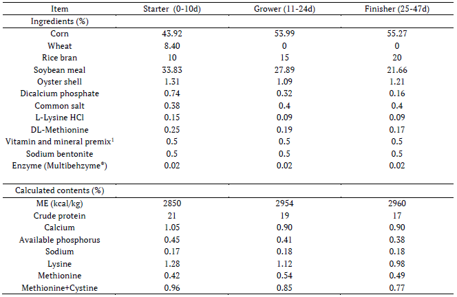 The first treatment (control) fed a diluted diet including rice bran without probiotic or prebiotic (Table 1). All diets were formulated as 90% of nutrient requirements of the chickens as recommended by Ross 308 broiler management guide (Aviagen, 2009). The birds in treatment 2 received control diet which supplemented with 0.1% prebiotic A-Max Ultra® and treatment 3 fed the second diet plus 0.02% probiotic Multibehsil®.