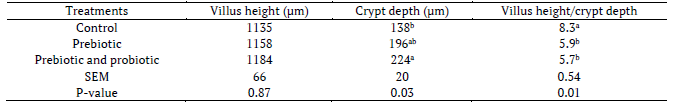 Analyses of gut histology are presented in Figure 1 and Table 2. Villus height was not influenced by feed additives. Crypt depth was significantly increased by feed additives in particular with concurrent use of prebiotic and probiotic (p < 0.05). The ratio of villus height to crypt depth was significantly decreased in treatment containing prebiotic alone or both prebiotic and probiotic (p < 0.05).