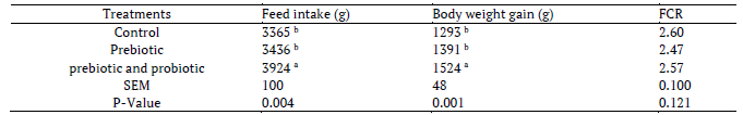 Analyses of serum components are presented in Tables 3. Serum components were not significantly influenced by the additives. Interestingly, simultaneous use of prebiotic and prebiotic in the diets significantly improved overall FI (feed intake) and BWG (body weight gain) (p < 0.05). The FCR (feed conversion ration) did not dramatically change because both BWG and FI increased (Table 4).