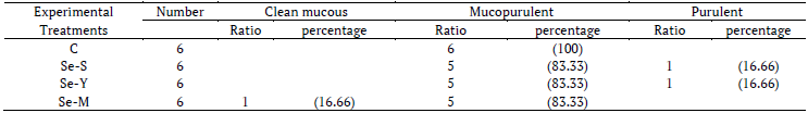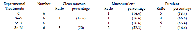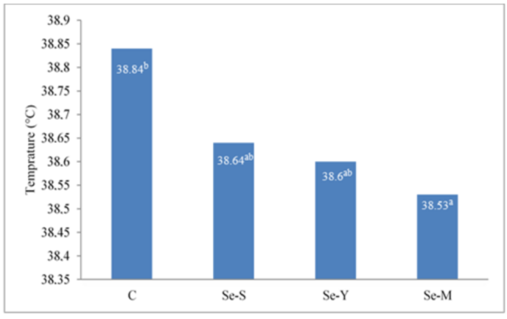 The average rectal temperature in the experimental treatments is shown in Fig 1. The rectal temperature in the treatment containing selenium methionine was significantly (p < 0.05) lower than that of the control group. On the other hand, vaginal secretions were less in this group than in other groups (Tables 4 and 5).