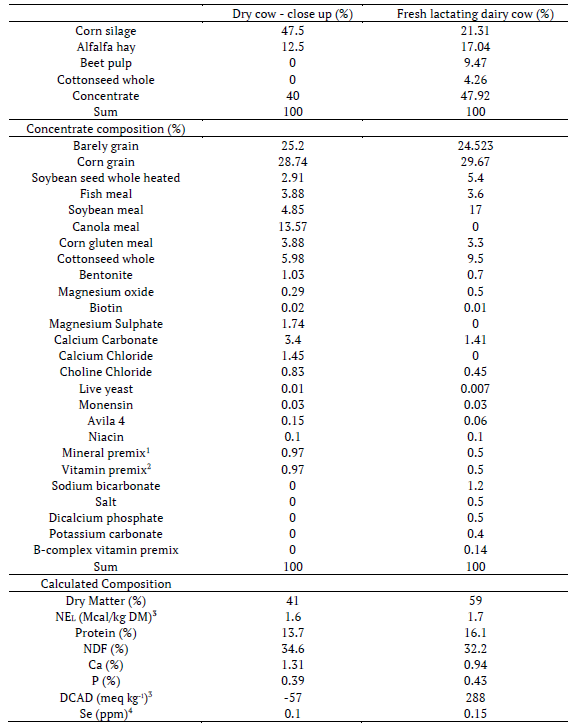 The present study was conducted in the FKA animal husbandry and Agriculture Company in the province of Isfahan Iran. The study began in the early May and lasted to late July, 2016. Twenty-four multiparous dairy Holstein cows (parity 3) with an average weight of 791 ± 50 kg were selected 21 days before the expected parturition. The previous production of their milk did not differ significantly (p = 0.88) and they were randomly assigned to four groups and placed in separate 3 × 3 m booths with separate drinkers and feeders. The diets were formulated based on NRC (2001) recommendation for a dry cow (close up period) and fresh lactating dairy cow (Table 1). The diets included: 1) basal diet without selenium supplementation (C); 2) basal diet plus 0.5 ppm Se in the form of sodium selenite (Se-S) 3) basal diet plus 0.5 ppm Se in the form of selenium yeast (Se-Y); 4) basal diet plus 0.5 ppm Se in the form of selenomethionine (Se-M). The Na2SeO3 (MerkCo., Germany) was used as the inorganic source of Se. The organic sources of Se were in the form of Se-enriched yeast (Biorigin., Brazil - Selemax 2000 ppm) and the form of Se-methionine (Arkop., Poland - Amino Selstar 2000 ppm). Selenium methionine, selenium yeast and sodium selenite supplements were used in addition to the control diet. The mineral supplement of the control diet was without selenium and all three forms of selenium were added to the total mixed ration as topdress. Before the morning feeding, daily feed residuals were collected, weighed and 300 g of them were frozen in nylon bags for the analysis. The amounts of Se concentrations in diets were measured by an Inductively Coupled Plasma-Mass Spectrometry (ICP-MS) device (using a Varian Model SpectrAA 220 atomic absorption spectrometer, Mulgrave, Victoria, Australia) (Table 1).