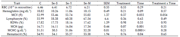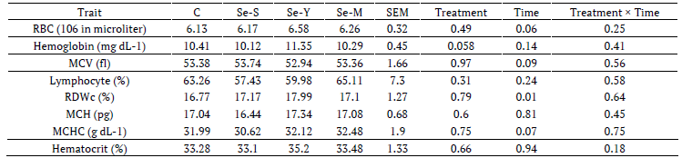 Shinde, Dass, and Garg (2009) consuming 0.3 ppm dry selenium in the form of sodium selenite in young buffalo rations, the researchers did not observe a change in the number of red blood cells, white blood cells, hematocrit, and hemoglobin concentration, which is consistent with the results of our study. Juniper, Phipps, Jones, and Bertin (2006) reported no significant difference in the number of red blood cells, white blood cells, hematocrit, and hemoglobin concentration in dairy cattle, broiler and sheep. There was no difference in hematological parameters in selenium fed lambs in the study of Mohri, Ehsani, Norouzian, Bami, and Seifi (2011). Faixova et al. (2007) observed that the number and resistance of red blood cells increased in lambs fed with diet containing 0.3 ppm selenium in dry matter in the form of selenium yeast.