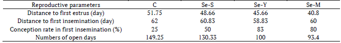 The present study showed that addition of selenium supplement during transition period reduced distance to the first estrus, first insemination and distance from delivery to pregnancy and increase conception percent in the first insemination (Table 6).