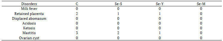 As shown in Table 7, the use of selenium supplementation during the transition period did not affect the incidence of milk fever, ketosis, acidosis, displaced abomasum and ovarian cyst. While there was a lower incidence of retained placenta and mastitis in selenium-fed cows compared to the control group, there was no observation of retained placenta and mastitis in selenium methionine group. Similar to our study results, other studies have shown that selenium supplementation has reduced retained placenta (Joksimović-Todorović & Davidović, 2013; Yosathai, 2014) and mastitis (Mehdi & Dufrasne, 2016; Sordillo, 2013) in dairy cows.