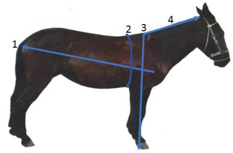 To this purpose, each mule was placed on a horizontal plane, standing on all four legs, with its legs parallel to each other and perpendicular to the support plane, body length, thoracic perimeter, withers height and neck length were measured according to Figure 1.