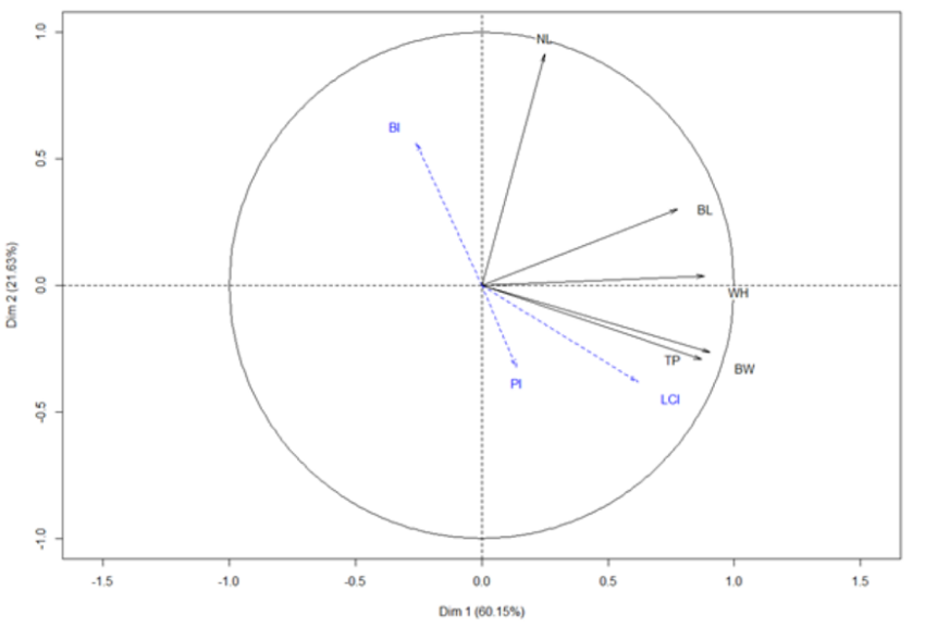 The principal component analysis demonstrated that the first two components explain 81.78% of the variance in relationships presented by morphometric variables and body indices. Figure 2 shows a positive relationship in component 1 (X-axis) between variables BL, WH, LW, TP, and LCI, and these, in turn, has a negative relationship with BI. A positive relationship was observed between NL and BI in component two (Y-axis).