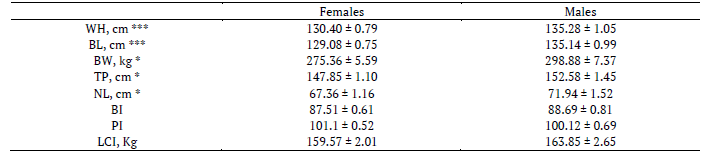 Body measurements and morphofunctional indexes are presented in Table 1. Males presented higher (P < 0.05) morphometric measurements, characterized as having a taller and longer body, increased weight, a larger TP and a longer neck. However, the morphofunctional indexes were similar between sexes, which indicate that these working animals, regardless of sex, maintain their body proportion. The origin location of the mules did not show significant differences, indicating that morphometric characteristics of the working animals in these areas are quite similar.