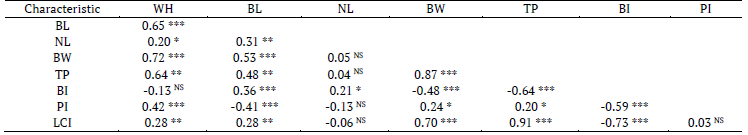 The coefficients of correlation between morphometric characteristics of working mules are presented in Table 2. The highest and positive correlations (r > 0.5) were obtained in WH-BL, WH-BW, WH-TP, NL-BW, TP-BW, BW-LCI, and TP-LCI and high but negative correlations (r < −0.5) were obtained in TP-BI, BI-PI, and BI-LCI. These results are similar to those reported in studies conducted in tropical countries (Yilmaz et al., 2012, 2013) where it is important to highlight that for working equids, based on the carriage capacity, it is necessary to search for phenotypically short-bodied or brevity individuals with a larger TP.
