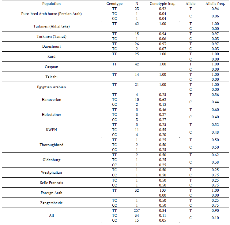 In the studied populations, 3 genotypes including CC, TC and TT were observed. The genotype of the five Iranian studied breeds of Turkmen (Akhal teke), Kurd, Caspian, Taleshi and Foreign Arab horse were TT (monomorph) and then the frequency of C allele was 0 and in the three other Iranian studied breeds consisting of Pure-bred Arab horse (Persian Arab), Dareshouri and Turkmen (Yamut) frequency of C allele was 0.060, 0.035 and 0.030, respectively. It shows that in Iranian Breeds C allele is rare, because these horses have been used since ancient times as a courier and for war and archery, hence selection has done to benefit of spiky horses with medium body that need less food and are tireless. While, for foreign breeds; Selle Francais, Zangersheide, Westphalian, Thoroughbred, KWPN, Hanoverian, Holesteiner and Oldenburg frequency of C allele was 0.75, 0.75, 0.75, 0.50, 0.48, 0.44, 0.40 and 0.38, respectively that can be concluded these breeds used in fields, forests, and mines, therefore, they needed a coarse and strong horses, but after the industrial revolution, the sports aspect of these horses; jumping was considered, and since the height and size of the animal had a high correlation with the jumping power, these breeds have two alleles.