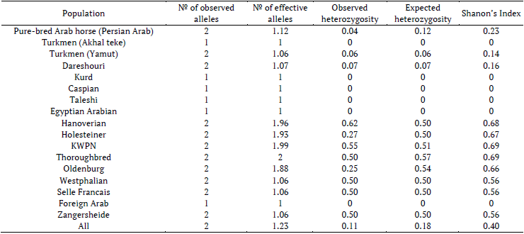 The genotypic and allelic frequencies of LCORL gene in studied horses have been shown in Table 2. In this study, the Hardy Weinberg equilibrium was estimated with Chi-square and G-square tests. The studied populations were not found to be in a Hardy-Weinberg equilibrium, as for years they have been under selection. The values of the population genetics parameters in studied horses have been shown in Table 3.