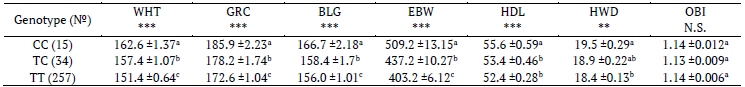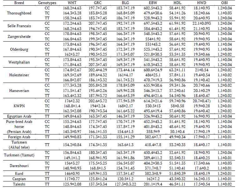 The results of comparing the mean of genotypes in the studied breeds showed that the EBW; estimated body weight (kg), WHT; withers height (cm), BLG; body length (cm) and GRC; girth chest (cm) were significantly affected by the LCORL polymorphism, so that the individuals with CC genotype had the highest value and the lowest value for those belonged to TT genotype and animals with TC genotype had the average value. For HDL; head length (cm), Tukey's test showed that individuals with CC genotype had a significant difference with TC and TT genotypes, but there was no significant difference between individuals with TC and TT genotypes. Least-squares mean of HWD; head width indicates that the TC genotype is overlapping with the CC and TT genotypes, but the genotypes of CC and TT have a significant difference. These results were the same as results of He et al. (2015) on Yili horse that identified that animals with the CC genotype have significantly larger withers height, body length, chest circumference, and cannon circumference than those with either the TC or TT genotype (p < 0.01). However, the TC genotype was larger than the TT genotypes. Other researchers (Boyko et al., 2014; He et al., 2015; Makvandi-Nejad et al., 2012; Metzger et al., 2013; Signer-Hasler et al., 2012; Tetens et al., 2013) reported the association of different alleles of LCORL and different criteria affecting body size in horse that confirmed results of this study.