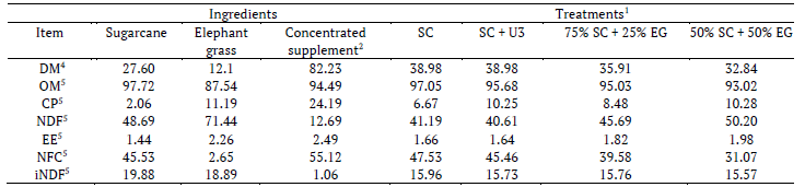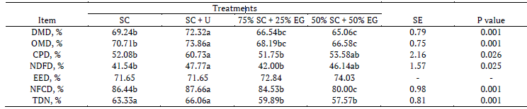 The treatments that had sugarcane as exclusive roughage (SC and SC + U) showed the highest TDN% values compared to the treatments with elephant grass (75% SC + 25% EG and 50% SC + 50% EG). This behavior most likely results from the higher NFC (Table 1) and NFCD values in the diets containing sugarcane as exclusive roughage, since these components refer to TDN% (Table 3).
