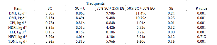 Ingestion of DM components (OMI, CPI, NDFI and TDNI) also increased with partial substitution of sugarcane for elephant grass (50% SC + 50% EG; p < 0.05), as a reflection of higher DMI (Table 2).