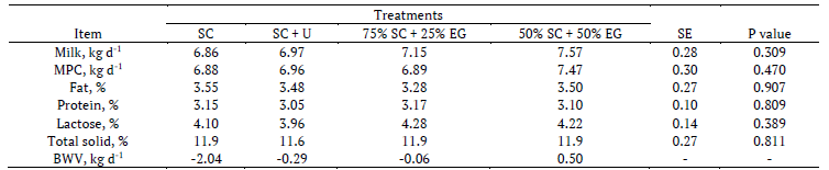 There was no difference (p > 0.05) between the studied treatments as to milk production and milk production corrected to 3.5% of fat (Table 4). The treatment with 50% replacement of sugarcane for elephant grass (50% SC + 50% EG), despite increasing TDNI and its components (Table 2), did not result in higher milk production. However, there was numerical increase in production (Table 4), which may indicate that this treatment provided more substrate to meet the animals' needs.