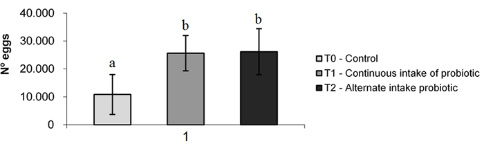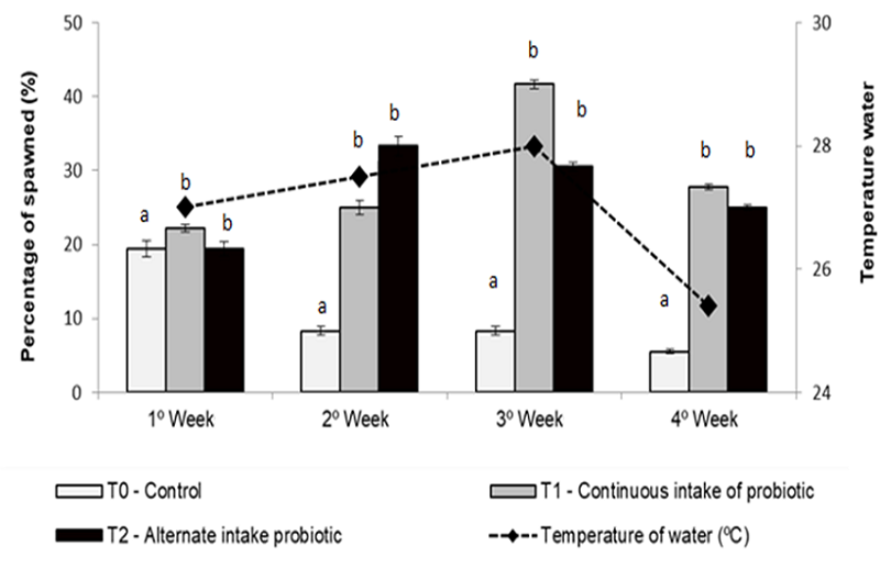 In the second breeding season, the females from the probiotic group spawned more eggs than females that received the control diet. In the fourth period, the temperature was reduced to a mean value of 24.5 ± 1.5º C. However, the spawning percentage remained satisfactory in T1 (27.7%) and T2 (25.0%) compared to T0, which achieved only 5.6% (Figure 1).